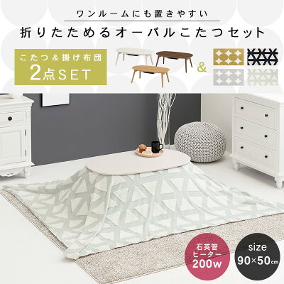 折りたたみオーバルこたつ 2点セット(こたつ90×50cm+掛け布団)【エリプス+スノウ】(こたつ セット こたつセット こたつ掛け布団 楕円 こたつテーブル 一人用 おしゃれ 洗える こたつ掛布団 かわいい 白 ホワイト ナチュラル 北欧 ブラウン 一人暮らし 柄 丸 三角)